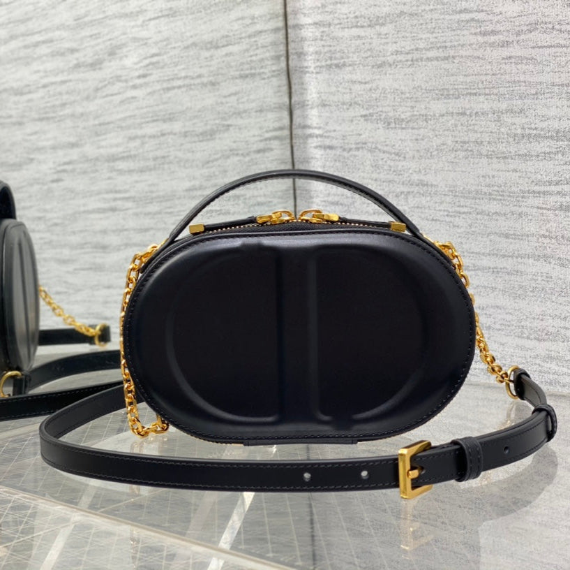 Signature Series Oval Camera Bag: Crafted from black cowhide with unique letter embossed logo and exquisite craftsmanship. Spacious compartment design, paired with leather top handle and adjustable detachable chain shoulder strap. Can be carried by hand, shoulder, or crossbody¡ªessential for daily outings.
