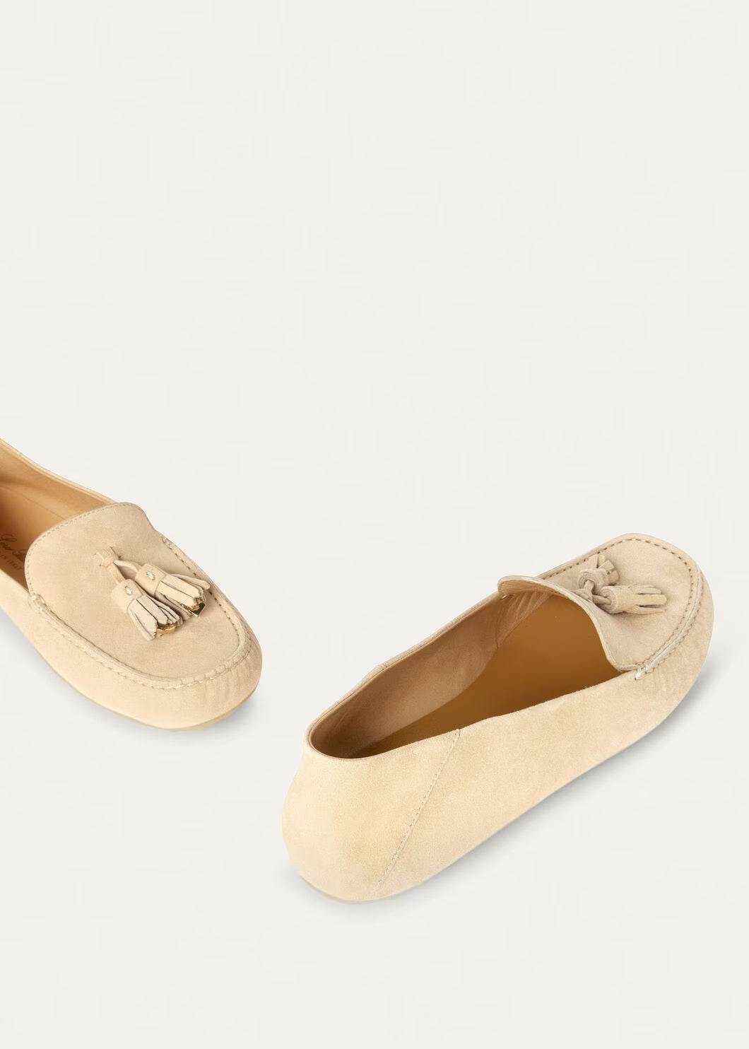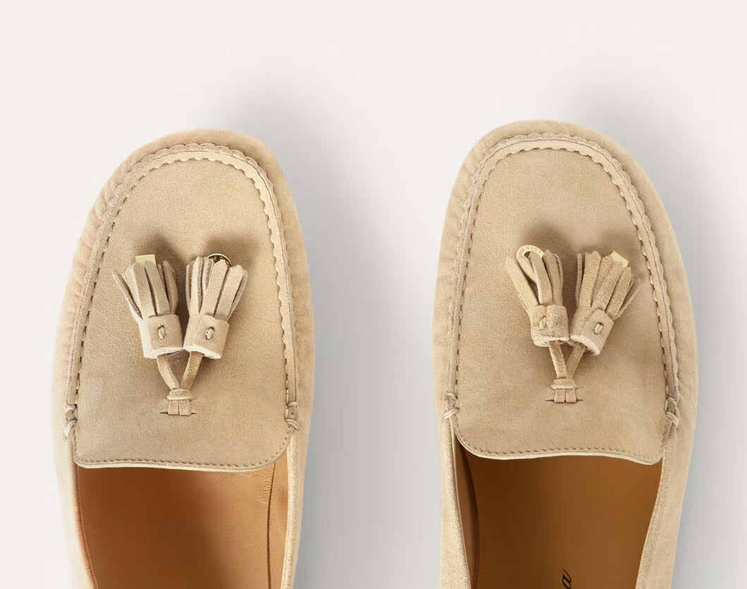 loafers made from soft made suede with water-repellent finish. Their informal laid-back style is enhanced by rubber soles, rubber pads and sabot-style collapsible heels. This lightweight, flexible style is enhanced My Charms tassels.