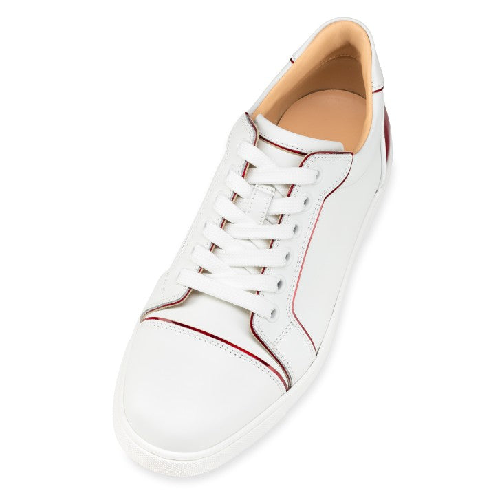 The Fun Louise Junior low-top trainer is inspired by the world of tennis and its supple construction is set on a rubber sole. Blending elegant and sporty lines, this iconic model is entirely crafted in white calf leather and Psychic Loubi red patent calf leather with iridescent hues. This model showcases Maison s exemplary creativity, featuring the creator's signature on the back and delicate topstitching.