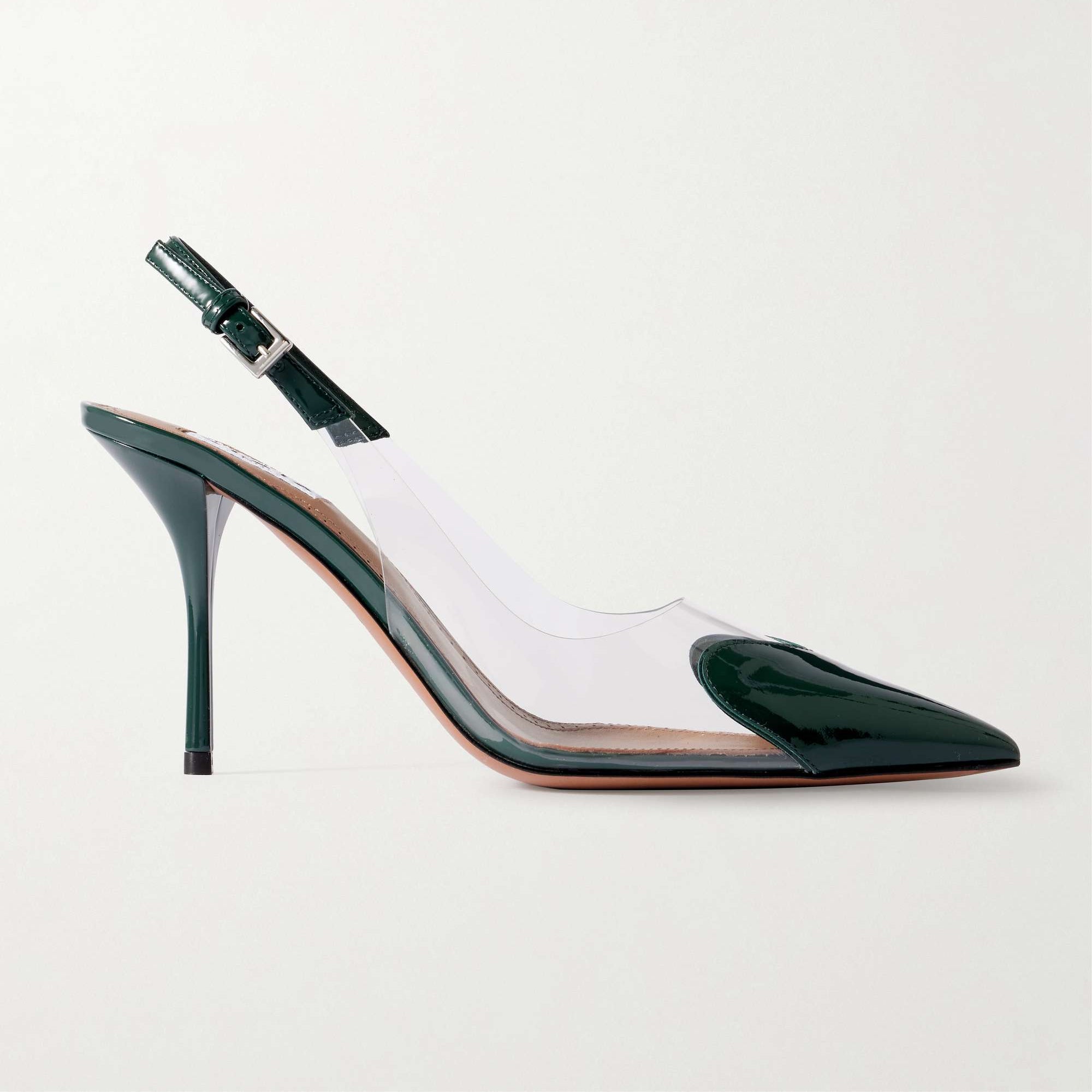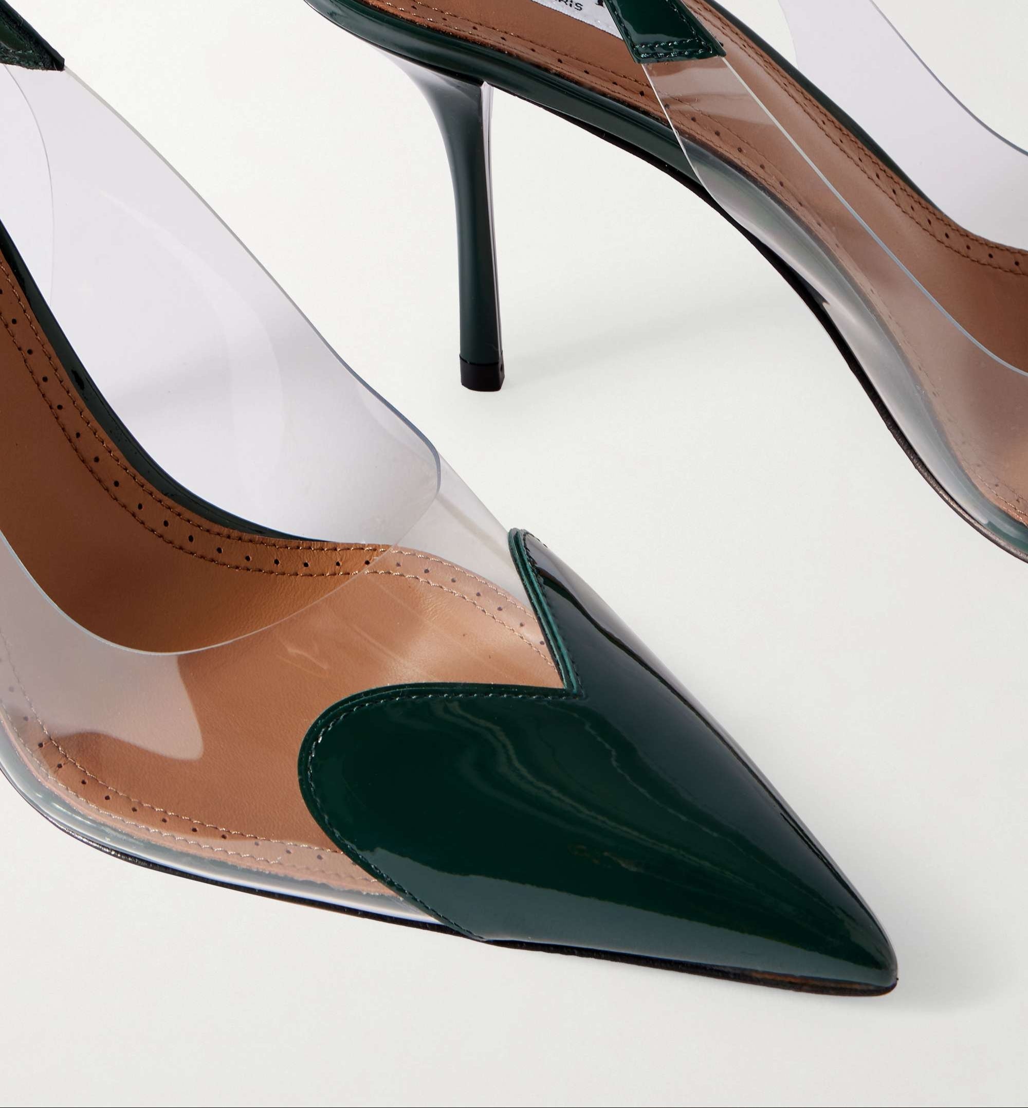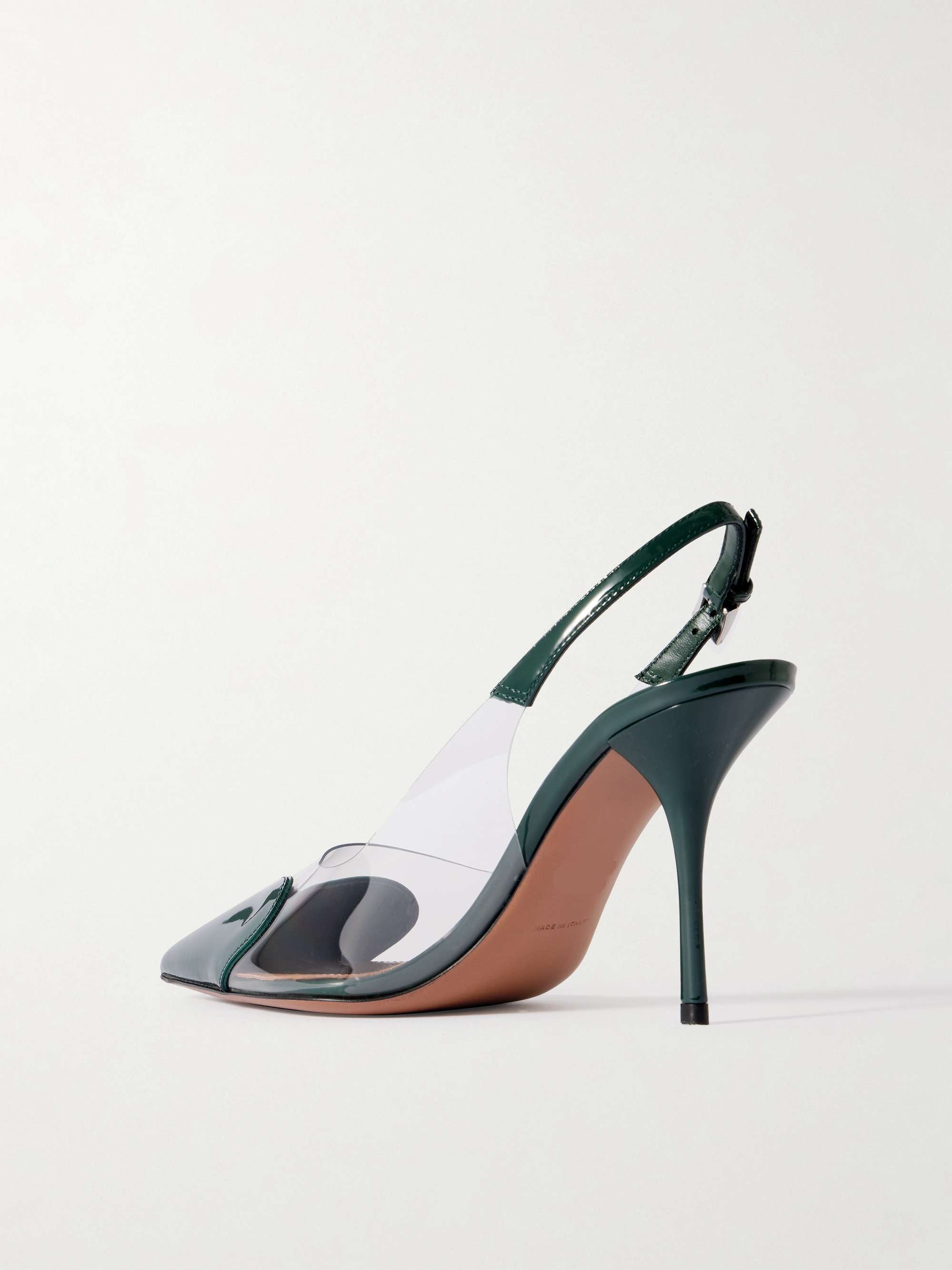 The pointed toes on pumps feature the same? Le Coeur hearts seen on the namesake bags. Crafted in Italy from patent-leather and PVC, they have 90mm heels and buckle-fastening slingback straps.