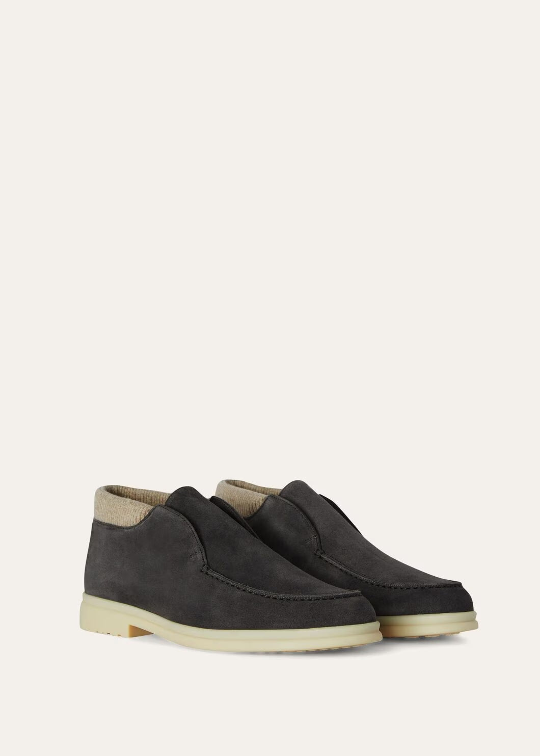 Classic chukka boots made from suede. They are enhanced by leather lining and a patented opening with elastic hidden under the tongue, guaranteeing an extremely comfortable fit. Perfect in casual or formal looks, they feature a lightly padded, ribbed cashmere-knit trim.