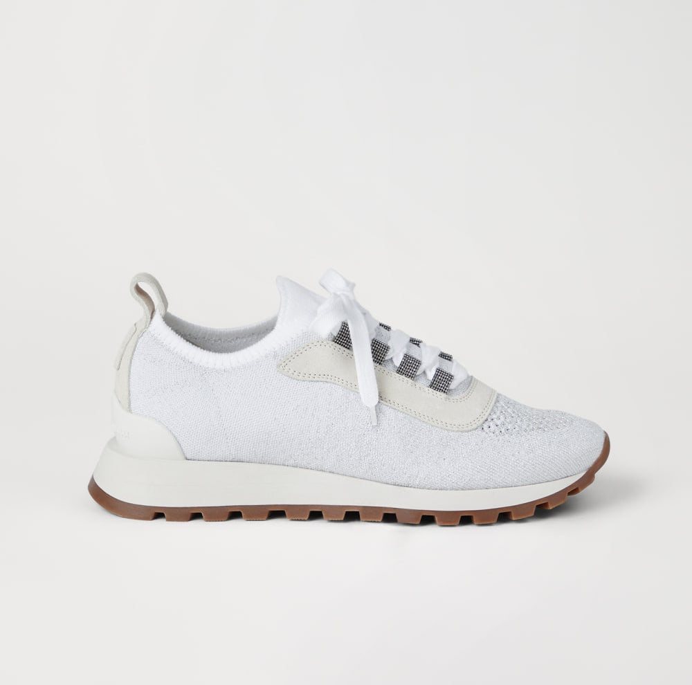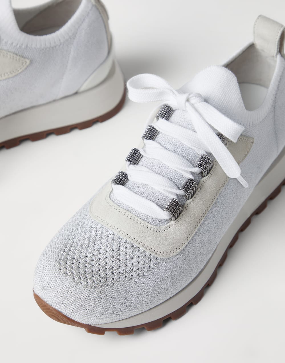 Precious details and texture contrasts enrich the? flavor of these new sneakers. The soft suede is combined with lightweight and semi-glossy technical fabric side inserts. Entirely embroidered in rows of shiny , the toe detail completes these sneakers with the iconic embellishment of the collections. Light grooves on the TPU heel counter insert and the back of the two-tone outsole complete this style with elegant details.