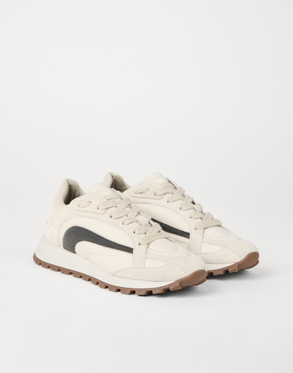 Precious details and texture contrasts enrich the? flavor of these new sneakers. The soft suede is combined with lightweight and semi-glossy technical fabric side inserts. Entirely embroidered in rows of shiny the toe detail completes these sneakers with the iconic embellishment of the collections. Light grooves on the TPU heel counter insert and the back of the two-tone outsole complete this style with elegant details.